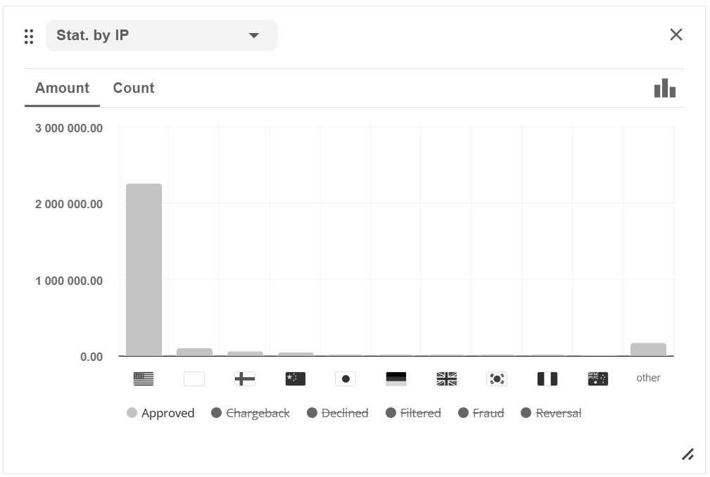button: the ratio by volume of transactions or by amount of payments, as well as by type of transactions (sale, capture, transfer, etc). Neogate Payment Gateway also displays statistics on negative activity and earnings.