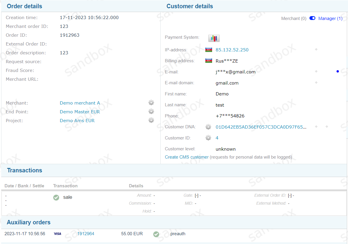 Below is an example of a successful transaction via the Master Endpoint. When Payer opened the Parallel Form, master transaction initiated an auxiliary transaction for the payment method selected on the form. Once the auxiliary transaction received final sucessful status, it triggered final successful status on the master transaction: