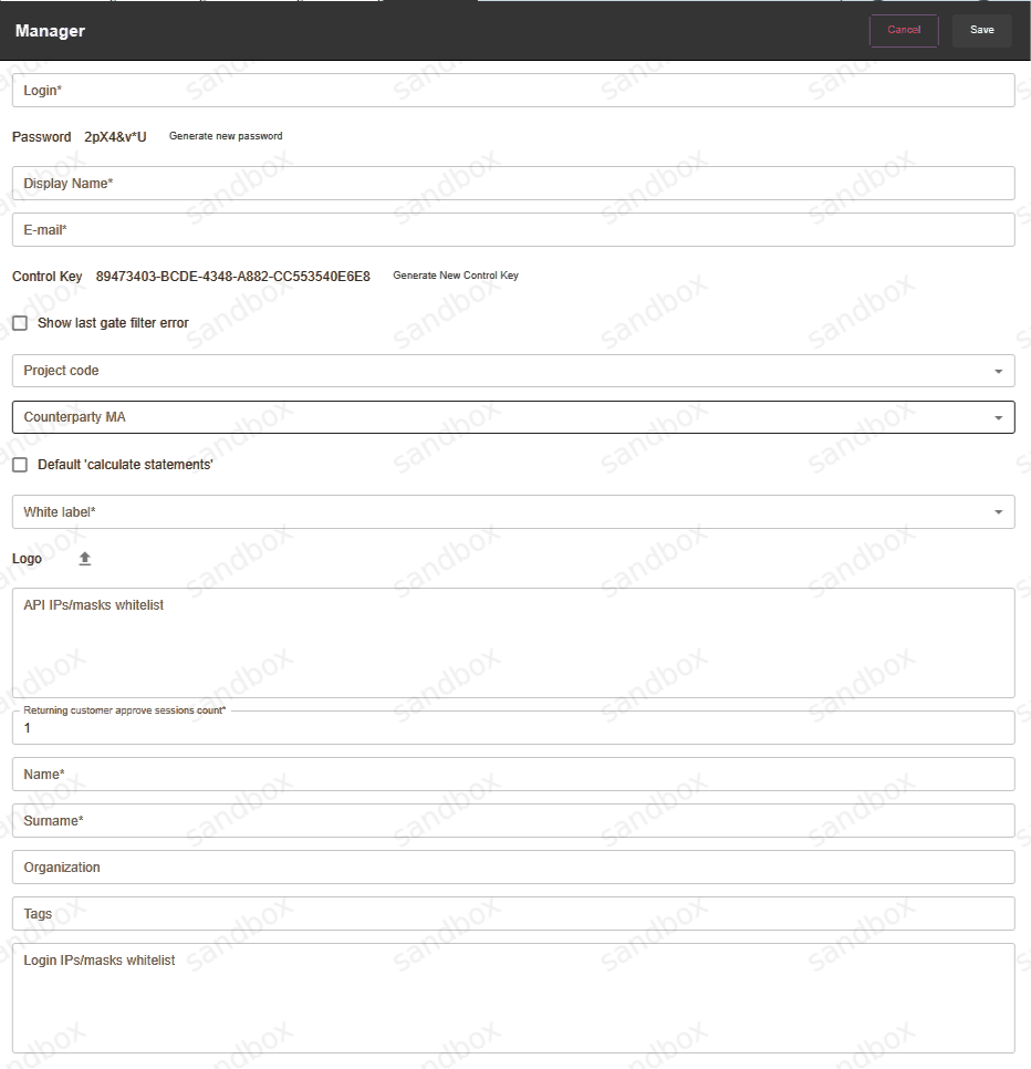 Neogate platform contains integrated calculation system to reflect the tariffication between business process partners. Calculation happens on each level, from dealer to merchant. Bank fees are calculated for tariffication and settlement, but statements for settlement with the bank are not provided by the system. Instead, the system calculates statements per Merchant and indicates which exact amount should be received from the bank. Statement is individually generated for each manager or each merchant of this manager. Statement date is called business day. Statement for business day contains all projects for chosen manager. Statements will be calculated for manager if such option is enabled. If statement should be calculated, enable the Default calculate statements flag in manager account details. If this option is not enabled, statements setting in projects of exact manager will be unavailable and statements are not calculated.