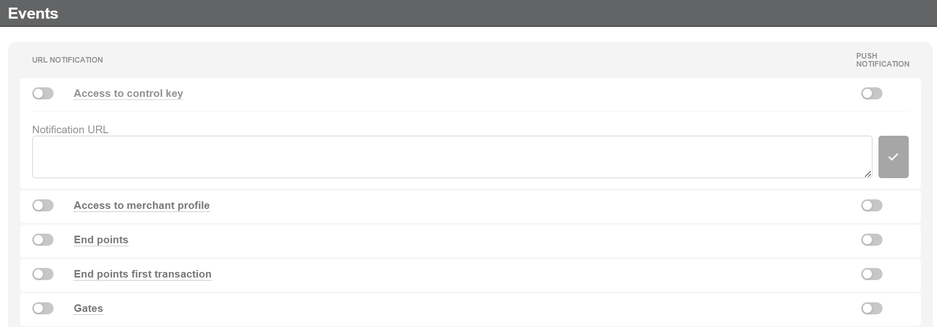 “Access to control key” event sends notification to the specified URL about viewing of the merchant control key by any user of the system.