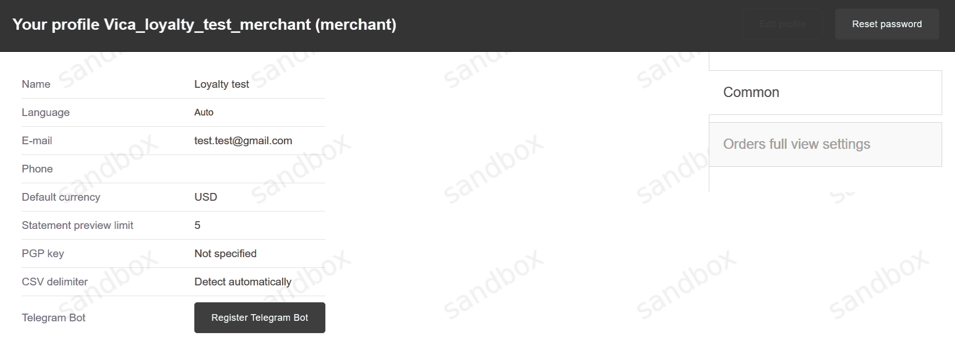 By clicking on Merchant name on the top left side of header menu you will be redirected to user profile with two profile configuration tabs on the right side of the page: “Common” and “Orders full view settings”: