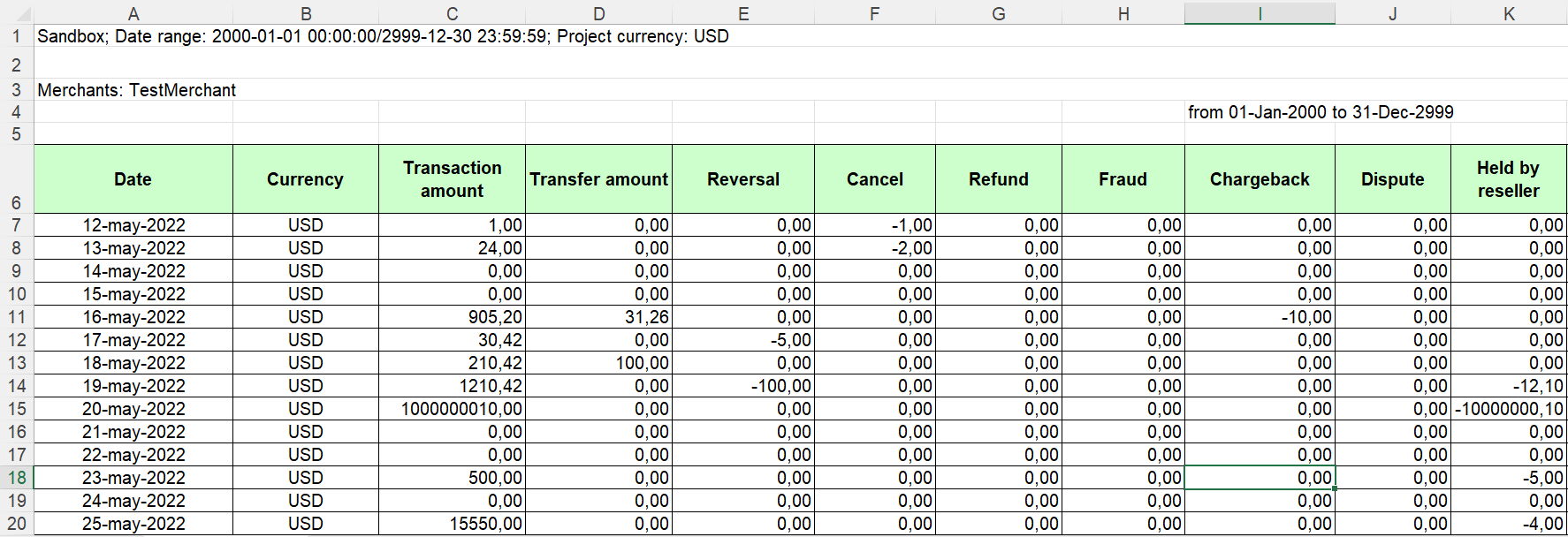 This report calculates transaction turnovers: sale, chargeback, and reversed funds. It shows the distribution of turnover with commissions and the approximate profit for the selected period, as well as day-by-day earnings. To download the necessary data, the following criteria are used: dates, project, currencies.