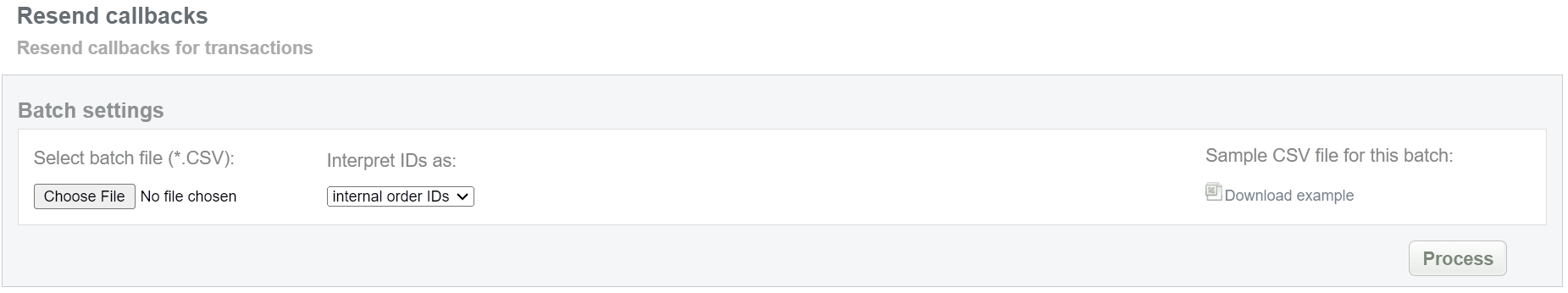 This batch operation can be useful if information on the final status of transactions is available in Neogate system and for some reason is not available in the Connecting Party system. Collect the order IDs, assigned by Neogate system to the CSV file and upload it to send new callback notifications. An example of CSV file for upload is available on the same screen.