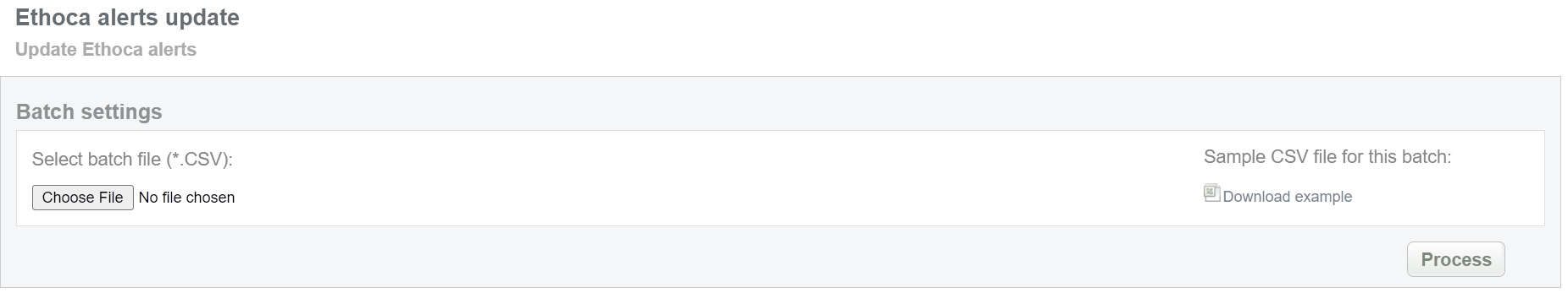 This batch operation can be useful for updating Ethoca statuses. Collect the order IDs, assigned by Neogate system to the CSV file and upload it to send statuses to Ethoca system. An example of CSV file for upload is available on the same screen.