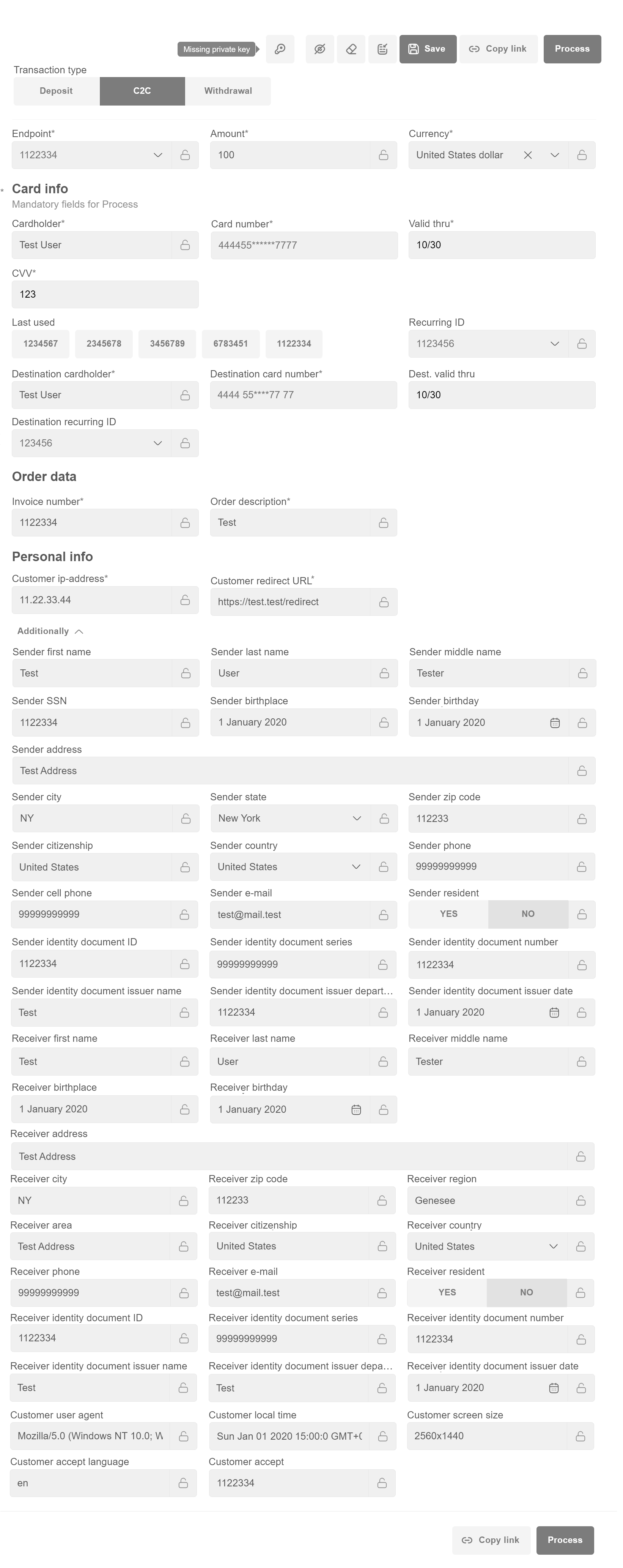 The Merchant fills the cardholder data or use recurring IDs for both sender and receiver of funds directly on VT and initiates transfer processing with “Process” button. In this case the transaction must be processed through the non3D channel, which is not common for C2C transfers.