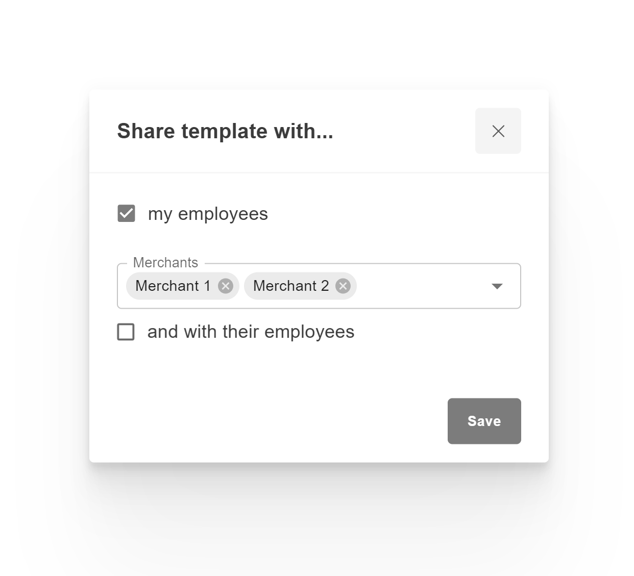 3) To edit, clone, delete or share, click three dots near the template name and select the desired parameter. The template can be shared with users at lower levels. This way, a merchant can share the template with their employees.