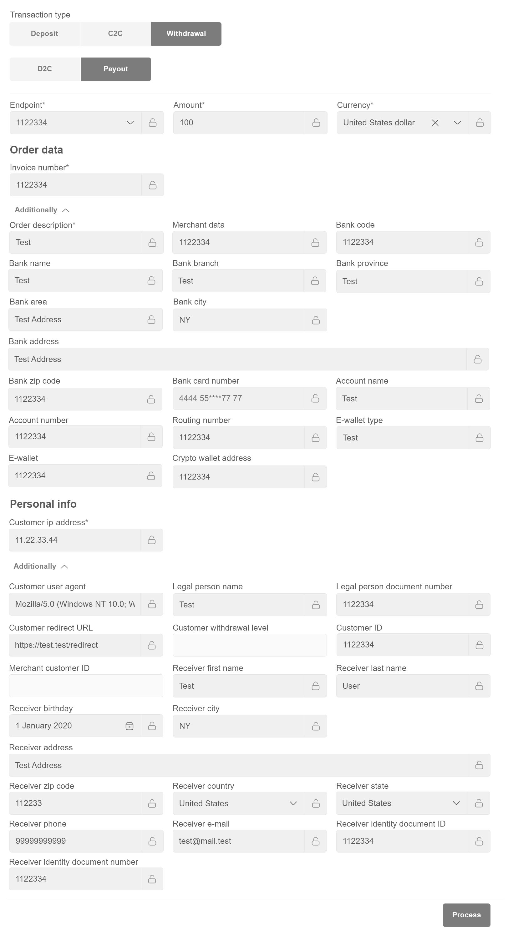 - Use “Process” button if transaction doesn’t require any additional information submitted by customer (e.g. noCVV non3D recurring transactions).